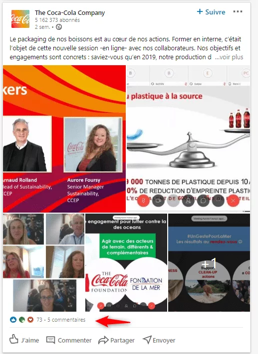 當你考慮到對於相同的參與度,一個頁面的瀏覽量少了 5-10 倍,你可以估計當可口可樂在 LinkedIn 上發帖時,該頁面獲得 300-500 次瀏覽……對於 500 萬訂閱者,我會讓你想像達到的程度累積 150個訂閱者的公司頁面。 CQFD!